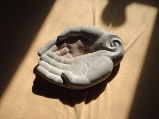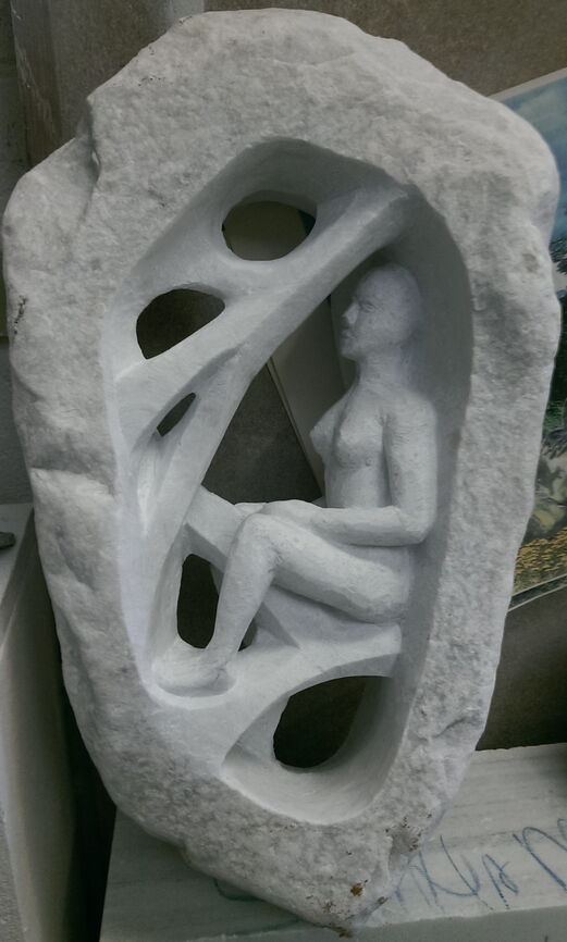 Die Skulptur wurde in einen Stein (ca 50x25x12cm) aus einem Flussbett in Carrara gehauen. Die Aussenseite wurde bewusst in der natürlichen Form belassen.